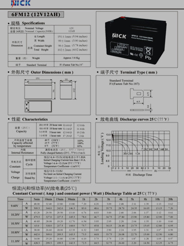 产品技术特性: 高度均一性:<20MV 超长浮充及循环寿命80% DOD800次以上 符合国际搞震要求;耐过流冲放电冲击;高效电率特性等。 铅锡多元合金:内阻小,耐腐蚀,能经受长期使用 ABS工程查塑料外壳;不易变形;抗老化。 硅氟橡胶密封帽;安全、防爆 铜基镀银端子;接触电阻小。