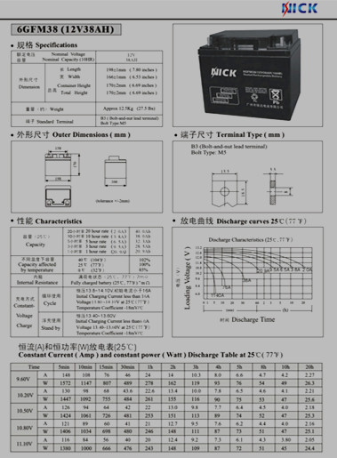 产品技术特性: 高度均一性:<20MV 超长浮充及循环寿命80% DOD800次以上 符合国际搞震要求;耐过流冲放电冲击;高效电率特性等。 铅锡多元合金:内阻小,耐腐蚀,能经受长期使用 ABS工程查塑料外壳;不易变形;抗老化。 硅氟橡胶密封帽;安全、防爆 铜基镀银端子;接触电阻小。
