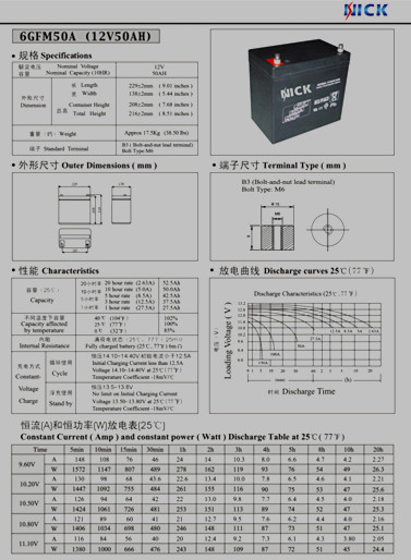 产品技术特性: 高度均一性:<20MV 超长浮充及循环寿命80% DOD800次以上 符合国际搞震要求;耐过流冲放电冲击;高效电率特性等。 铅锡多元合金:内阻小,耐腐蚀,能经受长期使用 ABS工程查塑料外壳;不易变形;抗老化。 硅氟橡胶密封帽;安全、防爆 铜基镀银端子;接触电阻小。